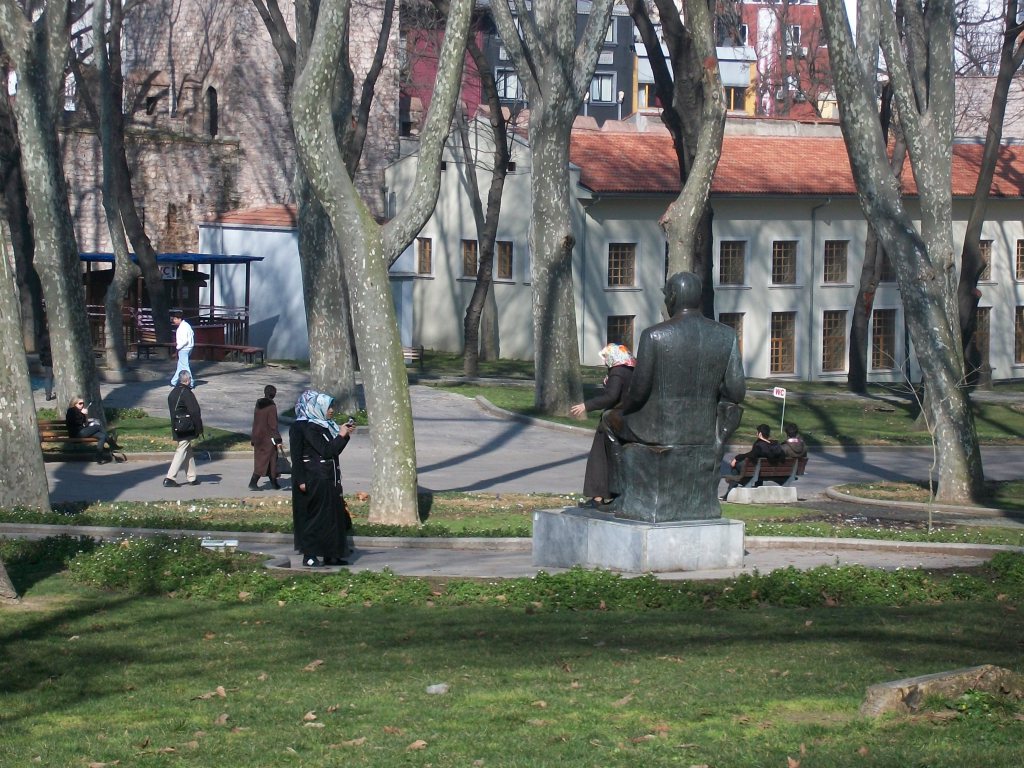 From a spot in Gülhane park, one can keep a clear sight of the lines of people posing with the Atatürk statue. A bronze figure on a stone base, he is a prime spot for visitors to pay their respects with a flash. Many people climb up to lean on their leader, others stand politely in front. A tall man in pointy shoes crawls up, then leans into a plié to fit in the viewfinder. Small boys hustle to the statue and pat Atatürk on the shoe.