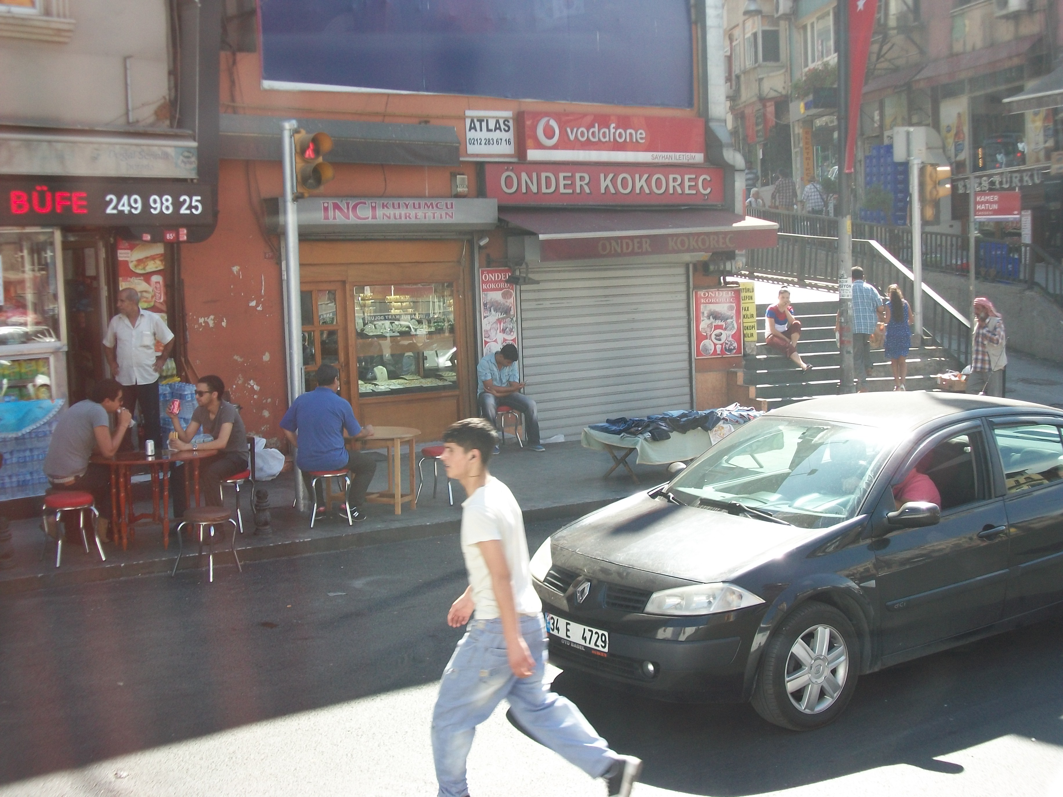 Pamuk was writing this about the Turkish people, and this was a little crosswalk in Istanbul. I had my eye on the man by the restaurant–the posture of patient-impatience.