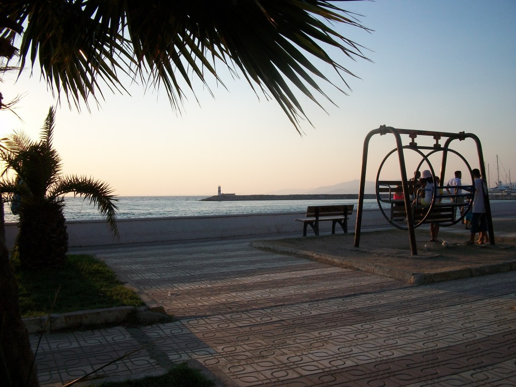 At the park, the family waits for their turn on a swing. The huge contraption has two benches that face each other so the family can all sit together–knees to knees –and sway back and forth. Mom and daughter take the side facing the sea. Dad holds the toddler son. The son gapes from under a blue hat, horrified by the structure now caging his mother, and not in the mood to join her.
