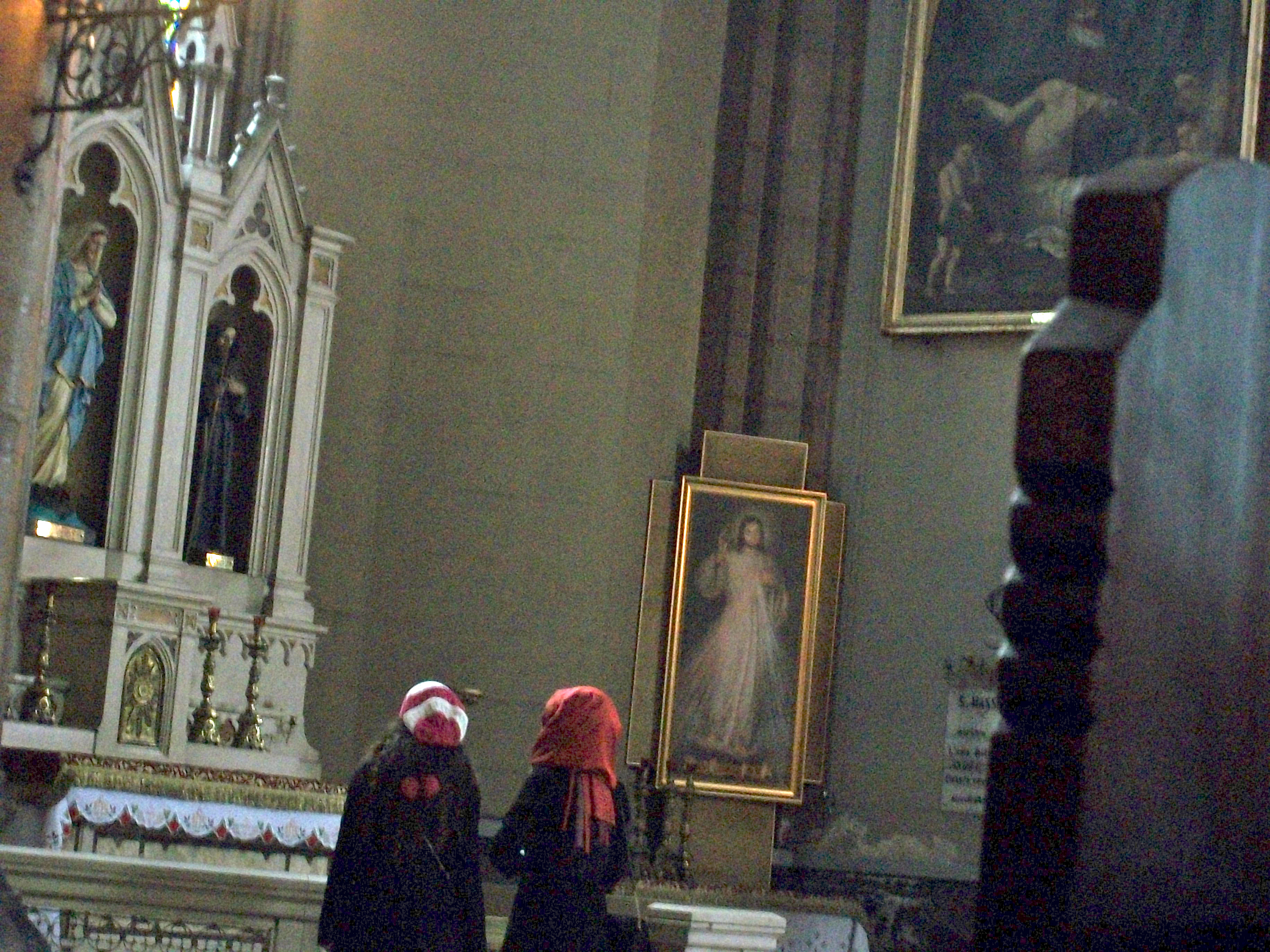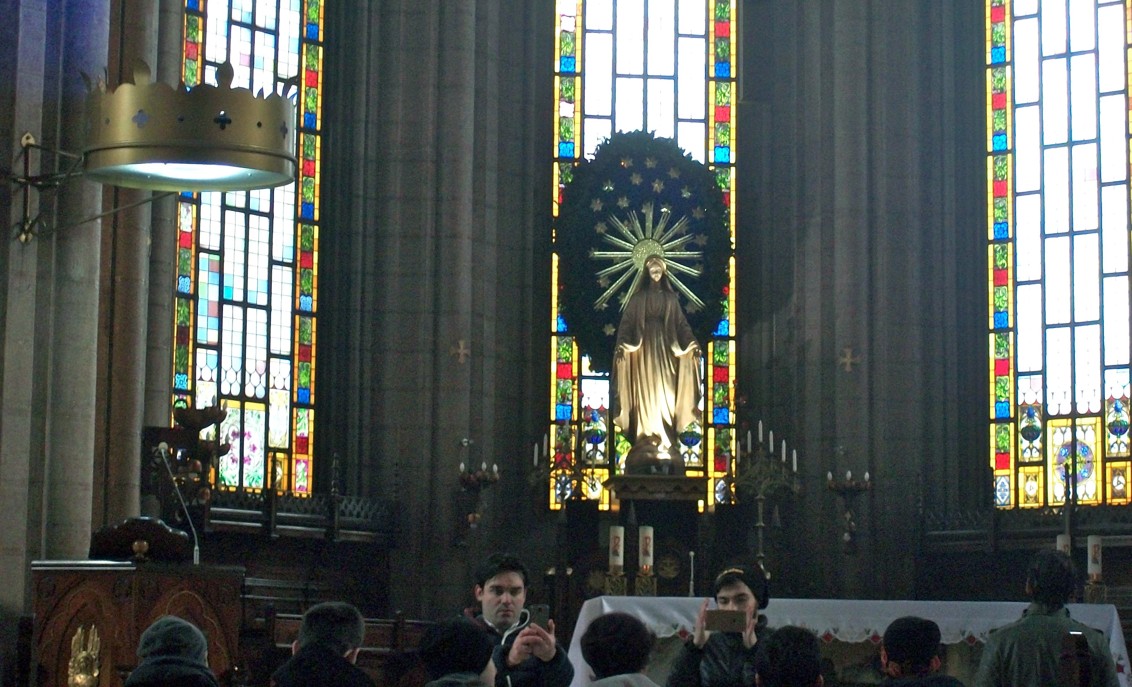 Every few minutes the caretaker shushes the visitors. They go quiet for a moment, then keep on talking. It doesn’t disturb me as I kneel, watching young men walking cautiously into the church and pausing for a set of photos by the lovely Virgin Mary statue at the front. It’s one of my favorites.
